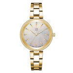 Аналоговое отображение времени делает их легко читаемыми, а перламутровый циферблат, украшенный стразами, добавляет нотки роскоши и glamour в любой образ. Круглая форма и золотистый цвет корпуса, выполненного из высококачественной латуни, делают часы настоящим произведением искусства. Браслет из нержавеющей стали также золотистого цвета гармонично дополняет дизайн, гарантируя долговечность и комфорт при носке.