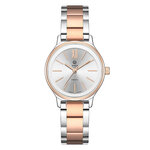 Корпус из прочной латуни с хромированным покрытием привлекает внимание своим лаконичным дизайном и долговечностью. Белый циферблат с четкими отметками облегчает считывание времени, а романтичный цвет браслета из нержавеющей стали в оттенке розового золота добавляет изысканности и шарма.