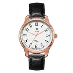 Корпус из латуни с изысканным покрытием цвета розового золота придаёт часам элегантность и уникальность, а белый циферблат с арабскими цифрами обеспечивает максимально удобное восприятие времени. Классическая круглая форма делает эти часы универсальным аксессуаром, подходящим как для деловых встреч, так и для повседневного ношения.
