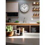 Часы выполнены в нежном сером корпусе из прочного пластика, который обеспечивает долговечность и лёгкость. Нежно-правильный белый циферблат с арабскими цифрами отлично читается с любого расстояния, что делает их удобными для использования на кухне, в гостиной, спальне или коридоре.
