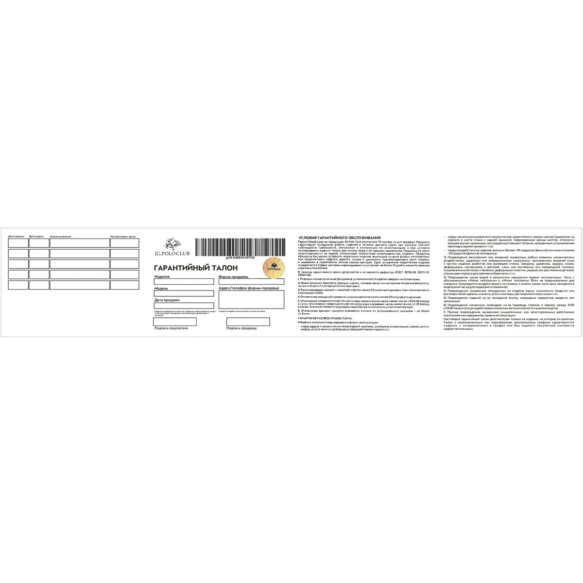 Информируем Вас о том, что наша компания создала гарантийное обслуживание часов JG.Polo Club на территории России. Теперь к каждым часам JG.Polo Club мы предоставляем фирменный гарантийный талон. Гарантийный ремонт осуществляют авторизованные сервисные центры в 37 городах России.
