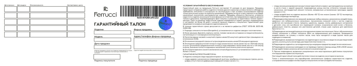 Информируем Вас о том, что наша компания создала гарантийное обслуживание часов Ferrucci на территории России. Теперь к каждым часам Ferrucci мы предоставляем фирменный гарантийный талон. Гарантийный ремонт осуществляют авторизованные сервисные центры в 37 городах России.