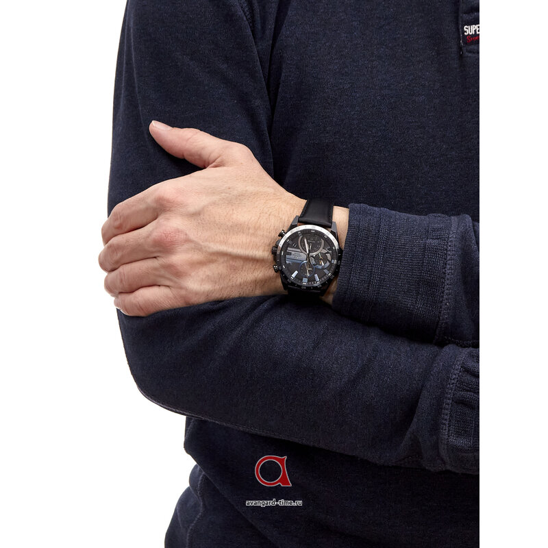 Черный корпус из нержавеющей стали и кожаный ремешок в черном цвете придают часам элегантный и стильный вид. Темно-серый циферблат с отметками и дополнительными циферблатами делает их еще более привлекательными.