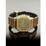 Модель выполнена в золотистом цвете с прямоугольным корпусом, который идеально дополняет серый циферблат с арабскими цифрами. Браслет из пластика также золотистого цвета, что придает часам изысканный вид.