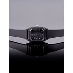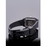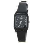 Классический прямоугольный корпус изготовлен из прочного пластика черного цвета, что придаёт изделию элегантный и сдержанный вид. Черный циферблат украшен арабскими цифрами, которые легко читаются, что делает часы удобными для повседневного использования. Ширина ремешка составляет 12 мм, а длина — 170 мм, что обеспечивает комфортную посадку на запястье.