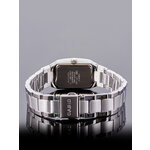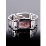 Часы выполнены в прямоугольной форме с хромированным корпусом и браслетом из нержавеющей стали, что гарантирует прочность и долговечность. Розовый циферблат с четкими отметками создает романтичный и утонченный вид, а высококачественное минеральное стекло защищает часы от повреждений.