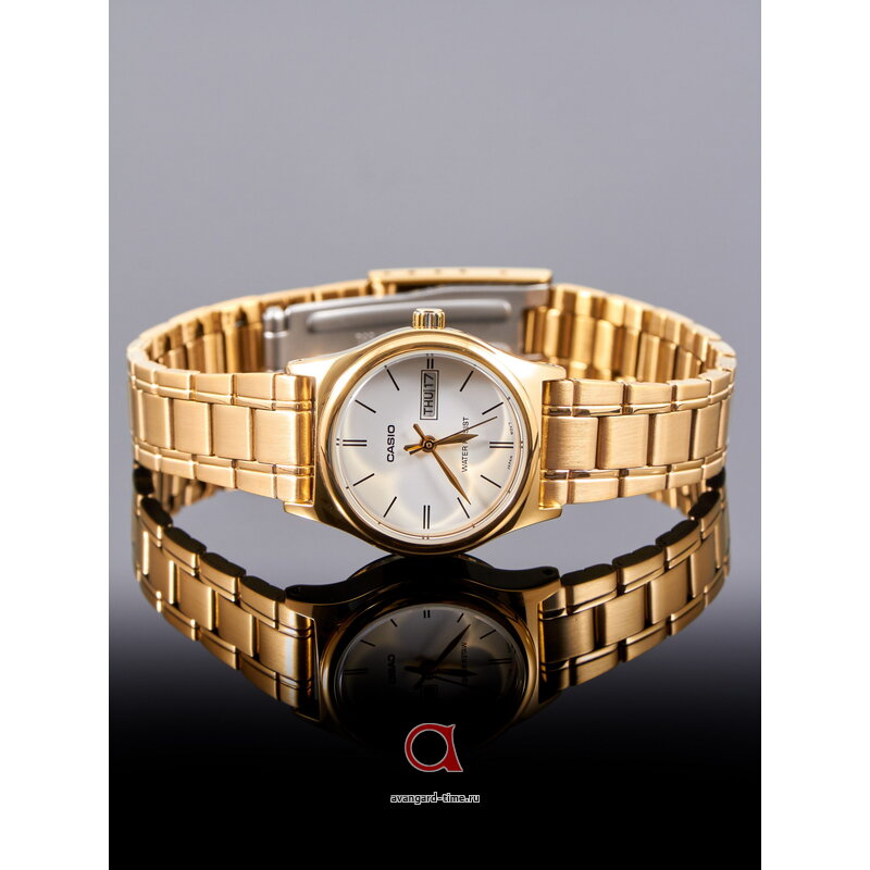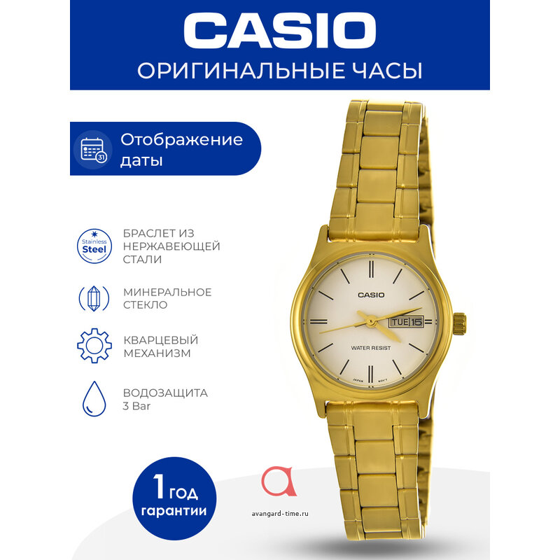 Почувствуй себя обладательницей элегантных часов Casio LTP-V006G-7B! Классический стиль и изысканный дизайн делают эту модель идеальным выбором для взрослой аудитории. Золотистый корпус и браслет из нержавеющей стали придадут твоему образу особую изысканность, а белый циферблат с отметками и календарем помогут тебе всегда быть в курсе времени. Часы оснащены кварцевым механизмом, источником энергии является батарейка. Корпус изготовлен из прочного сплава Alloy, стекло минеральное, класс водонепроницаемости 3 Bar. Длина ремешка 175 мм, ширина 14 мм. Наслаждайся стильным и надежным аксессуаром от Casio каждый день! Гарантия - 1 год. Страна-изготовитель - Китай. Декларация соответствия: ЕАЭС N RU Д-JP.РА02.В.16409/21. Дата регистрации и окончания действия сертификата - 29.10.2021 и 28.10.2026 соответственно.