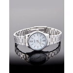 Эти наручные часы имеют аналоговый способ отображения времени с яркими арабскими цифрами на серебристом циферблате. Корпус изготовлен из прочного сплава Alloy, а браслет выполнен из нержавеющей стали цвета хром. Минеральное стекло надежно защищает циферблат от повреждений.