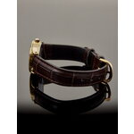Часы имеют аналоговый способ отображения времени с желтым циферблатом и арабскими цифрами. Золотистый корпус из сплава эффектно сочетается с коричневым кожаным ремешком длиной 185 мм и шириной 14 мм.
