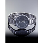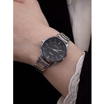 Черный циферблат с комбинированной индикацией легко читается в любое время суток, добавляя к вашим образам нотку строгости и sophistication. Металлический ремешок из нержавеющей стали с серебристым оттенком не только придаёт часам прочность, но и обеспечивает высокий уровень комфорта при носке. Его длина составляет 170 мм, а ширина - 16 мм, что делает эти часы универсальным аксессуаром для женщин с любым запястьем.
