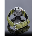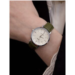 Корпус часов выполнен из прочного хромированного алюминия, что обеспечивает надежность и долговечность, а стильный бежевый циферблат с четкими делениями и акцентами отлично контрастирует с зеленым кожаным ремешком, который подарит вам комфорт на протяжении всего дня. Длина ремешка составляет 190 мм с шириной 16 мм, что делает эти часы идеальными для большинства женских запястий.