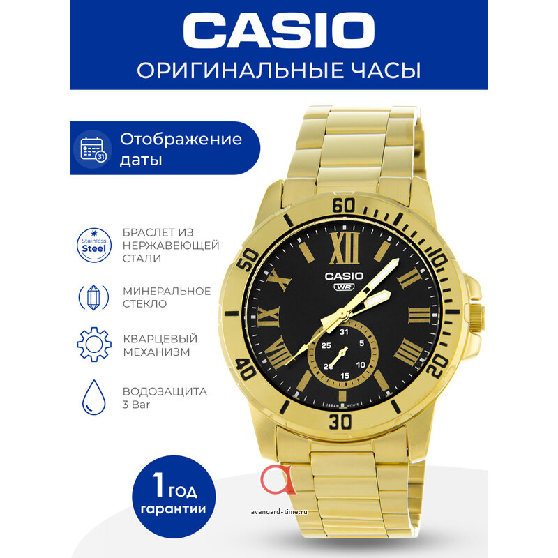 Часы наручные MTP-VD200G-1B - это элегантный аксессуар для стильных мужчин. Классический дизайн с аналоговым способом отображения времени и черным циферблатом с римскими цифрами создают изысканный образ. Золотистый корпус и браслет из нержавеющей стали придают часам роскошный вид.