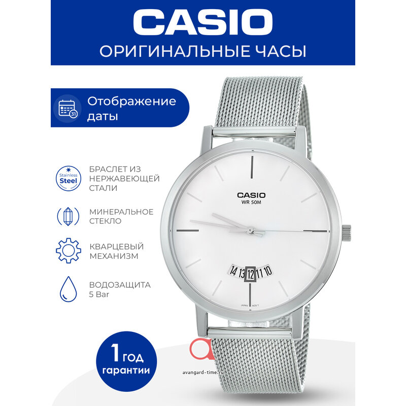 Представляем вам стильные и надежные часы наручные Casio MTP-B100M-7E! Этот классический аксессуар идеально подойдет для взрослых мужчин. Часы имеют аналоговый способ отображения времени с белым циферблатом и отметками. Корпус из нержавеющей стали с хромированным покрытием придает часам элегантный вид. Серебристый браслет также выполнен из нержавеющей стали. Высококачественное минеральное стекло обеспечивает защиту циферблата. Часы работают от батарейки и оснащены календарем. Класс водонепроницаемости 5 Bar позволяет использовать их в повседневной жизни без опасений. Гарантия от производителя на часы составляет 1 год. Приобретайте качественные и стильные часы Casio MTP-B100M-7E, созданные для успешных и стильных мужчин!