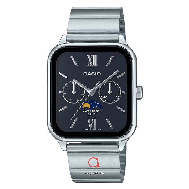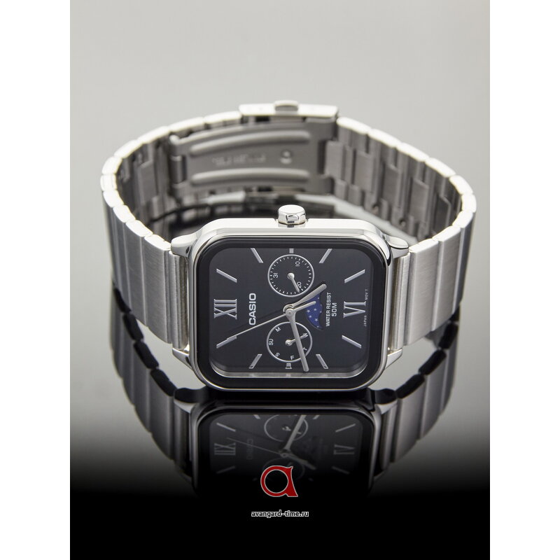 Часы наручные MTP-M305D-1A2 от Casio - это стильный аксессуар для взрослых мужчин. Аналоговый способ отображения времени в комбинации с синим цветом циферблата придает им модный вид. Прямоугольный корпус из нержавеющей стали с хромированным покрытием и серебристым браслетом добавляют ощущение роскоши. Часы оснащены календарем, индикатором фазы луны и дополнительными циферблатами. Механизм на кварцевом основании источник энергии от батарейки обеспечат точное показание времени. Класс водонепроницаемости 5 Bar позволяет использовать их в повседневной жизни. Casio гарантирует качество продукции, поэтому на часы предоставляется гарантия 1 год. Приобретайте оригинальные часы Casio MTP-M305D-1A2 для элегантного и практичного аксессуара на каждый день. Made in China.