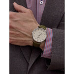 Корпус часов выполнен из хромированного сплава, что придаёт им элегантный внешний вид и надёжность. Круглая форма циферблата окрашена в стильный бежевый цвет, который прекрасно сочетается с кожаным зеленым ремешком. Такой контраст привлекает внимание и делает часы великолепным аксессуаром для любого мужского гардероба.