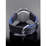 Спортивный стиль этих часов выражается не только в их функциональности, но и в изысканном дизайне: круглая форма корпуса в ярком синем цвете гармонично сочетается с серым циферблатом, покрытым арабскими цифрами. Браслет, выполненный из кожи и текстиля, обеспечивает комфортную посадку и надежное крепление на запястье, длиной 190 мм и шириной 21 мм.