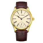 Шикарные наручные часы Михаил Москвин Elegance 4115L-5 станут отличным дополнением к вашему стилю. Эти классические часы имеют аналоговый способ отображения времени с желтым циферблатом и римскими цифрами. Золотистый корпус из нержавеющей стали и коричневый кожаный ремешок придают этим часам роскошный вид.
