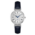 Эти часы выполнены в элегантном круглом корпусе из нержавеющей стали серебристого цвета, что придает им стильный и современный вид. Способ отображения времени — аналоговый, а римские цифры на циферблате не только подчеркивают классический стиль, но и делают время легко читаемым. Серебристый циферблат идеально сочетается с синим кожаным ремешком, создавая уникальное и запоминающееся сочетание.