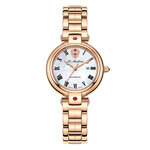 Аналоговый способ отображения времени с римскими цифрами добавляет классический шарм, в то время как перламутровый циферблат создает эффект изысканности, сверкая в лучах света. Корпус из нержавеющей стали цвета розового золота и браслет из того же материала дополняют этот шедевр, делая его идеальным дополнением к любому наряду.