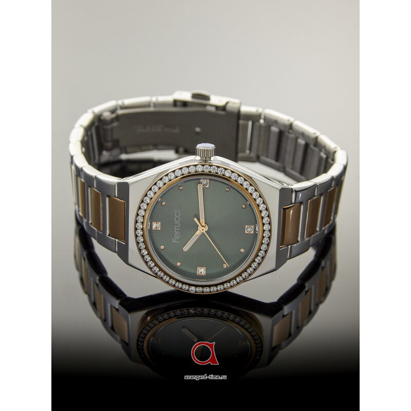 Шикарные женские часы FERRUCCI 03269-05 станут отличным аксессуаром для успешной и стильной женщины. Аналоговый способ отображения времени и круглая форма делают их классическими, а ремешок из нержавеющей стали в розовом золоте придает им изысканный вид. Зеленый циферблат с отметками и блеском стразов привлекает взгляды окружающих. Часы работают от батарейки и обеспечивают точное время благодаря механизму MIYOTA 2035. Alloy корпус и минеральное стекло делают часы надежными. Гарантия 1 год подчеркивает качество изделия. Водонепроницаемость 3 Bar позволяет использовать их в повседневной жизни. Приобретите эти часы для себя или в подарок — они подойдут взрослой женщине, ценящей красоту и стиль. Бренд FERRUCCI из Турции предлагает модные и качественные аксессуары. Made in China.