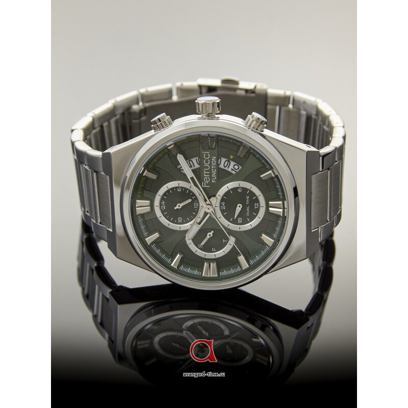 Шикарные часы FERRUCCI 03250-01 станут стильным дополнением к вашему образу! Этот классический аксессуар с аналоговым способом отображения времени подчеркнет ваш безупречный вкус. Корпус хромированного цвета изготовлен из сплава, а браслет – из нержавеющей стали. Циферблат зеленого цвета с отметками времени и дополнительными циферблатами, показывающими действующие часы. Часы работают от батарейки, что делает их удобными в использовании. Календарь и второй часовой пояс обеспечат вам дополнительные функции. Стойкое минеральное стекло защитит часы от царапин. Гарантия качества – 1 год. Подходят для взрослой аудитории, мужчине. Бренд FERRUCCI из Турции гарантирует надежность и стильность. Модель механизма JP15 от японского производителя. Часы имеют класс водонепроницаемости 3 Bar. Эти шикарные часы изготовлены в Китае, сочетая в себе качество и стиль. Украсьте свой образ стильными часами FERRUCCI 03250-01!