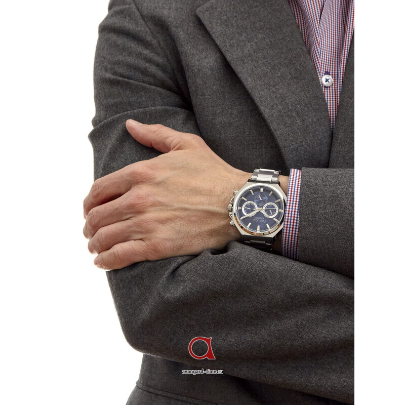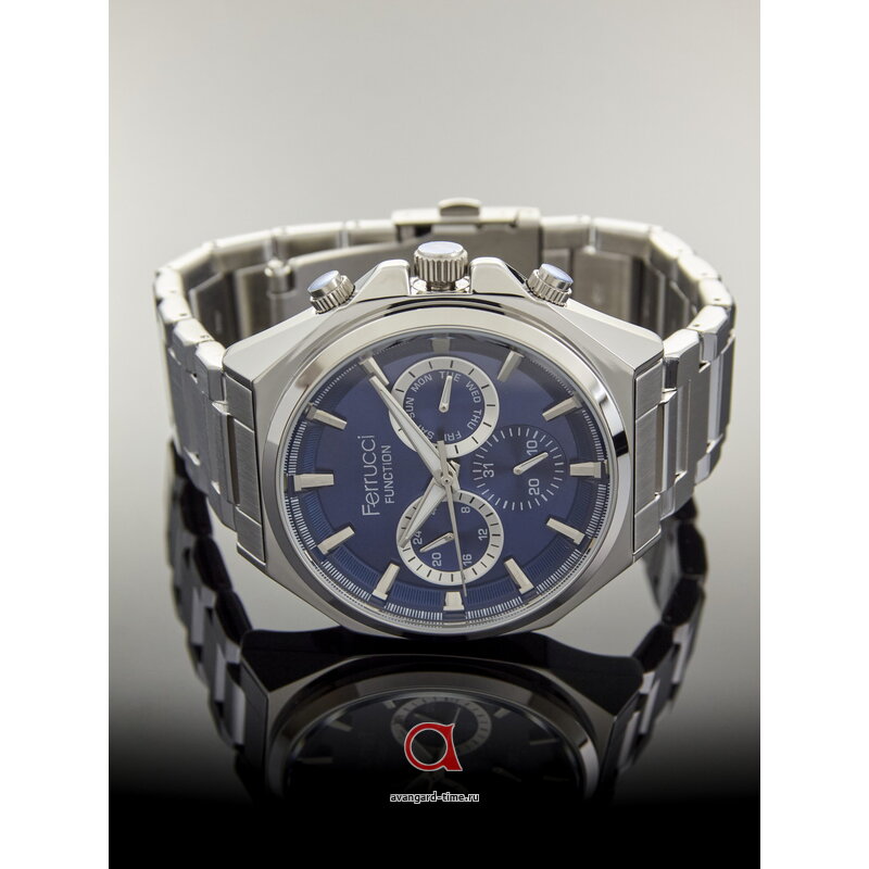 Шикарные наручные часы FERRUCCI 03319-02 обязательно понравятся ценителям классического стиля. Их элегантный круглый корпус хромового цвета и серебристый браслет из нержавеющей стали идеально дополнят ваш образ. Яркий синий циферблат с отметками времени и действующими циферблатами привлечет внимание окружающих.