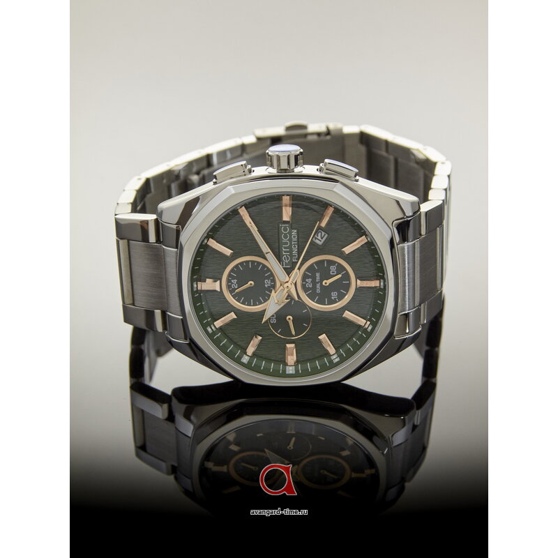 Представляем вам наручные часы FERRUCCI 03243-04! Эти элегантные классические часы с аналоговым способом отображения времени и круглой формой корпуса подчеркнут ваш безупречный стиль. Хромированный корпус и браслет из нержавеющей стали придают им надежность и долговечность. Зеленый цвет циферблата и отметки на нем делают эти часы особенно стильными. Аккуратные действующие дополнительные циферблаты и функции календаря и второго часового пояса сделают вашу жизнь более организованной. Механизм японского производства JP15 обеспечивает точность хода и долгую работу. Часы на батарейке с классом водонепроницаемости 3 Bar и минеральным стеклом станут надежным спутником в любых условиях. FERRUCCI 03243-04 – это идеальный выбор для современного взрослого мужчины, ценящего стиль, качество и функциональность. Покупайте с уверенностью – на часы предоставляется гарантия 1 год. Бренд FERRUCCI – это гарантия качества из Турции. Создайте неповторимый образ с наручными часами FERRUCCI 03243-04!