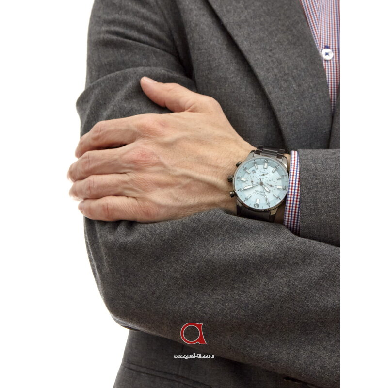 Изделие выполнено из высококачественной нержавеющей стали темно-серого цвета как корпус, так и браслет. Календарь и второй часовой пояс делают их необходимым аксессуаром для деловых людей и путешественников. Благодаря надежному источнику энергии от батарейки часы точно будут показывать время.