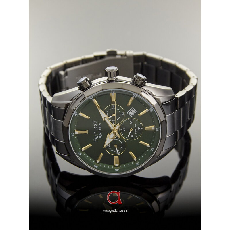 Шикарные часы FERRUCCI 14075-04 станут незаменимым аксессуаром для стильных мужчин. Их классический дизайн с аналоговым способом отображения времени и подсветкой удобен в использовании. Темно-серый корпус и браслет из нержавеющей стали придают изделию изысканный вид. Зеленый цвет циферблата и отметки индикации создают элегантный образ. Часы оснащены функцией календаря, вторым часовым поясом и дополнительными циферблатами. Источник энергии - батарейка. Гарантия на изделие действует 1 год. Часы FERRUCCI 14075-04 отличаются высоким качеством и стильным дизайном. Подарите себе или вашему близкому это изысканное украшение на каждый день!