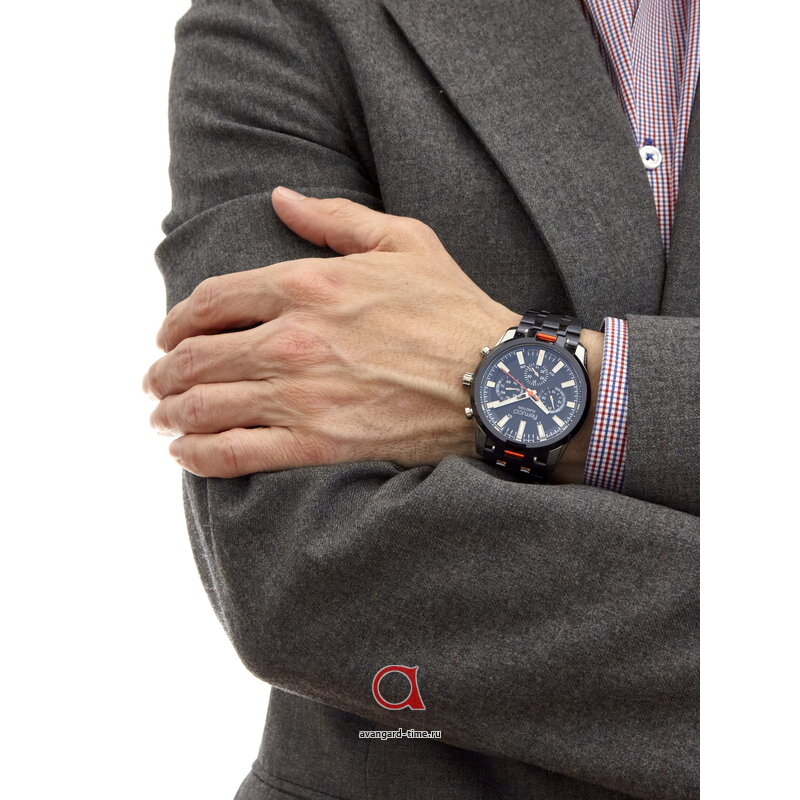 Синий цвет браслета и циферблата придают часам особую изюминку, а хромированный корпус добавляет им блеска. Аналоговый способ отображения времени с отметками и действующими дополнительными циферблатами делает их удобными в использовании.