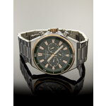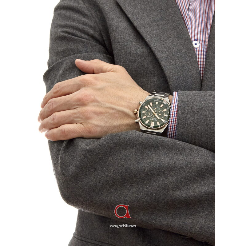 Корпус часов выполнен из прочного хромированного сплава, а браслет из нержавеющей стали с серебристым оттенком. Цвет циферблата – зеленый, что придает им особенный шарм и элегантность. Встроенные календарь и второй часовой пояс делают их еще более функциональными и удобными в повседневном использовании.