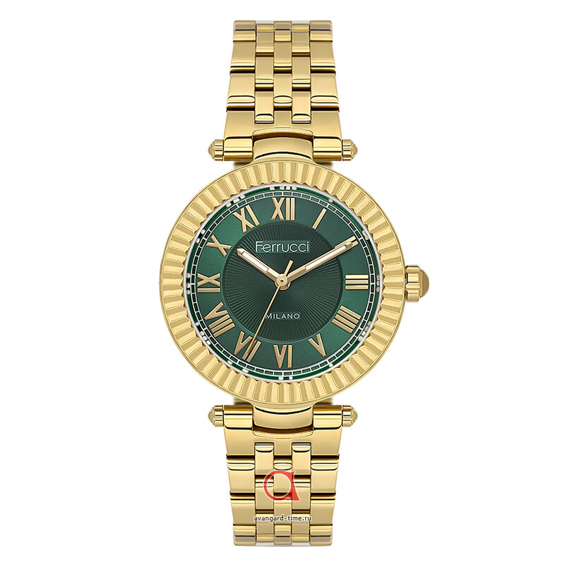 Часы FERRUCCI 03477-06 имеют классический аналоговый способ отображения времени, что делает их легкими и удобными в использовании. Стиль Fashion в сочетании с золотистым цветом корпуса и ремешка из нержавеющей стали привлекает внимание и подчеркивает вашу индивидуальность. Уникальный зеленый циферблат с римскими цифрами добавляет изюминку, а также обеспечивает четкость и читаемость времени.