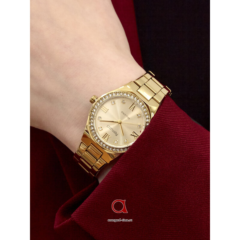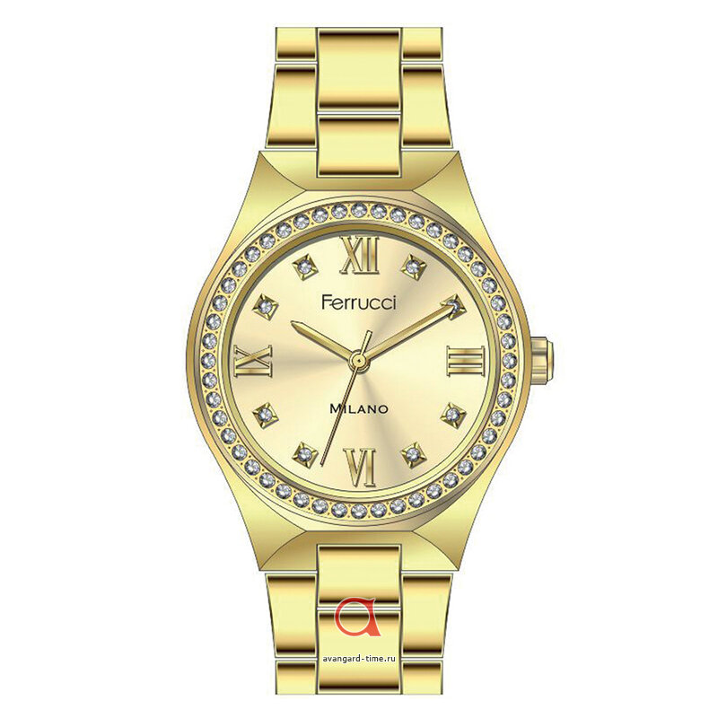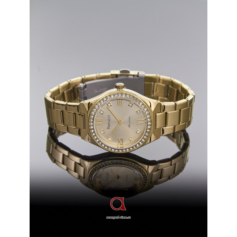Браслет этих часов изготовлен из нержавеющей стали, что обеспечивает долговечность и комфорт при носке. Его золотистый оттенок прекрасно сочетается с корпусом, а длина в 165 мм и ширина 17 мм делают часы идеальными для женского запястья. Дополнительный акцент в виде стразы на циферблате делает модель FERRUCCI 03480-03 ещё более притягательной и способной привлечь взгляды окружающих.