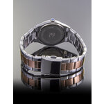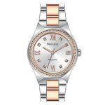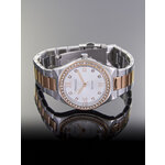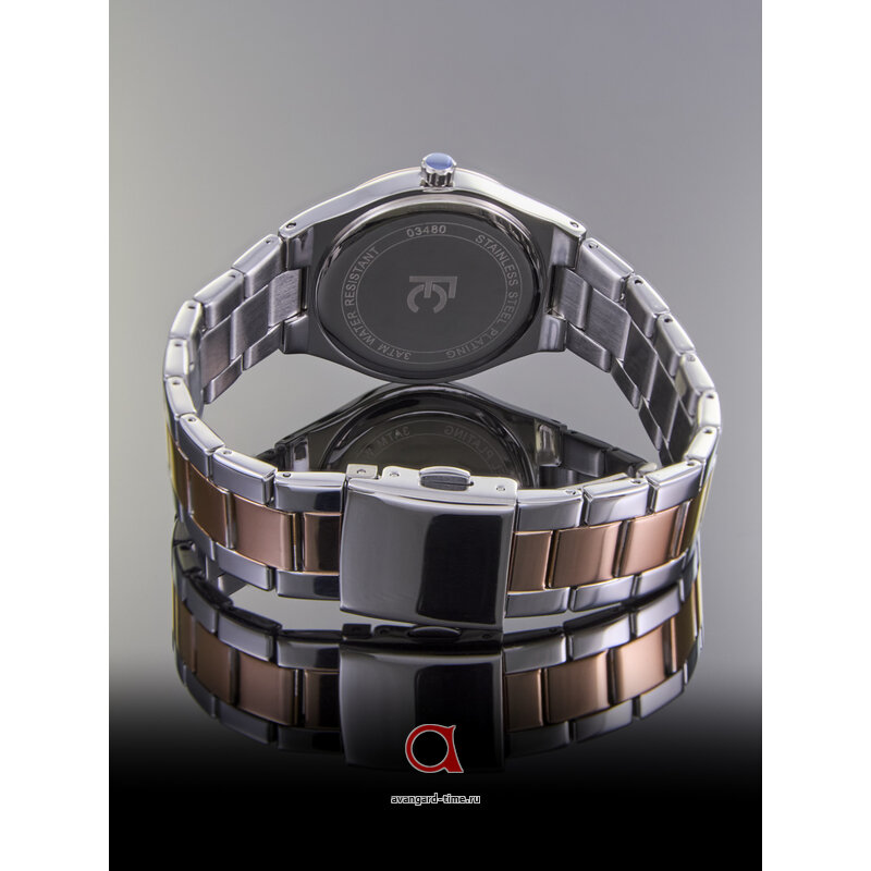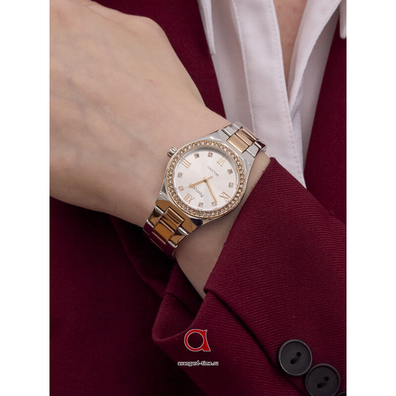 Изящная круглая форма корпуса выполнена в хромированном цвете, что придаёт им утонченный и современный вид. Браслет из нержавеющей стали, окрашенный в роскошный оттенок розового золота, добавляет нотку шика и делает часы универсальными для любого образа. Серебристый циферблат с комбинированной индикацией создает легкое контрастное сочетание, а сверкающие стразы придают часам дополнительную изюминку.
