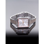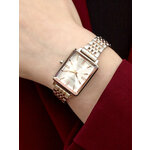Исключительный прямоугольный корпус, выполненный из прочного легкого сплава с хромированной отделкой, делает эту модель не только стильной, но и надежной. Серебристый циферблат, дополненный эффектными стразы, привлекает внимание и подчеркивает вашу индивидуальность. Часы имеют аналоговый способ отображения времени с четкими отметками, что позволяет легко и быстро считывать время.