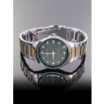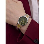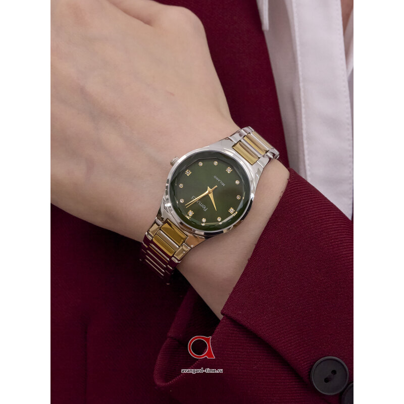 Циферблат в изысканном зеленом цвете привлекает внимание и дарит часы уникальность. В оформлении циферблата предусмотрены отметки и эффектные стразы, которые не только служат индикаторами времени, но и подчеркивают статус хозяйки этих часов. Кварцевый механизм с батарейным источником энергии обеспечивает надежность и точность, что так важно в повседневной жизни.