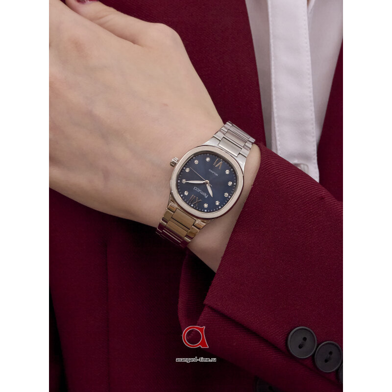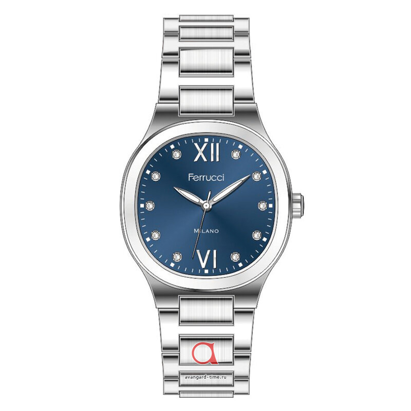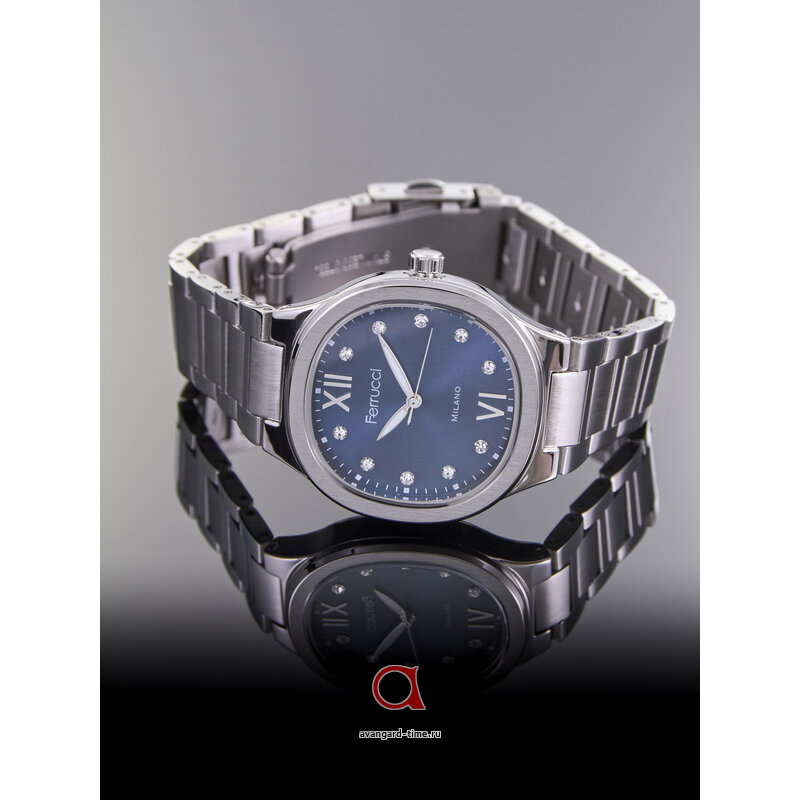 Часы FERRUCCI 03487-01 имеют круглый корпус из прочного сплава, выполненный в хромированном цвете, который гармонично дополняется браслетом из нержавеющей стали того же оттенка. Каждый день вносите нотку роскоши в ваш образ благодаря эффектному синему циферблату, украшенному стразами, которые придают часам неповторимое свечение.