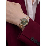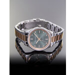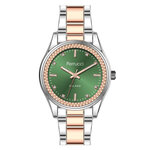 Часы имеют круглу форму и хромированный корпус, который отлично сочетается с розовым золотом браслета из нержавеющей стали. Зеленый циферблат с красиво оформленными стразами и отметками обеспечивает легкость считывания времени и добавляет изысканности вашему образу. Браслет с длиной 165 мм и шириной 15 мм идеально подходит для запястья, обеспечивая комфорт и стиль в каждом движении.
