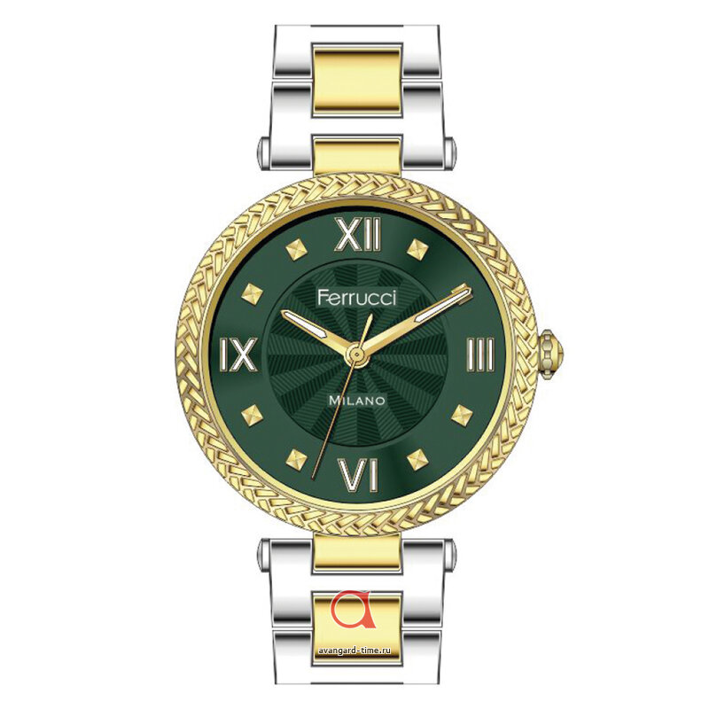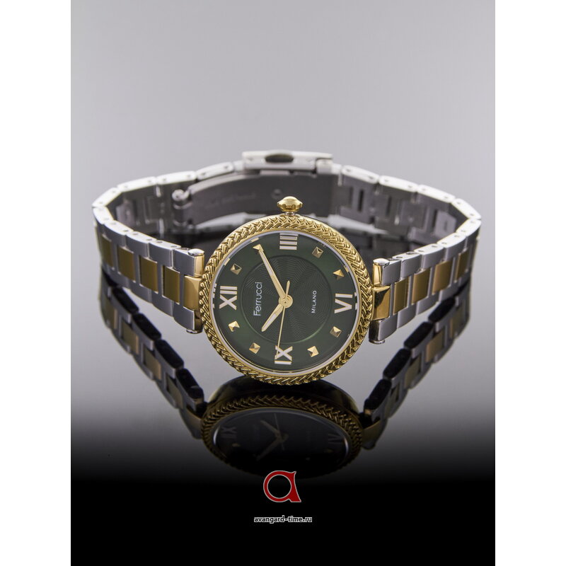 Шикарные женские наручные часы FERRUCCI 03491-03 – отличный выбор для стильных и модных леди! Аналоговый способ отображения времени в сочетании с зеленым циферблатом и золотистым корпусом создают неповторимый и изысканный вид. Подсветка позволит удобно смотреть время в любое время суток. Нержавеющая сталь и минеральное стекло гарантируют долговечность и надежность изделия. Кварцевый механизм обеспечивает точность хода часов. Часы обладают классом водонепроницаемости 3 Bar – можно носить их в повседневной жизни. Длина ремешка 175 мм, ширина 14 мм. Гарантия 1 год. Выполнены в стильном и современном дизайне бренда FERRUCCI. Наручные часы FERRUCCI 03491-03 – отличный подарок для взрослых модниц!