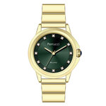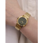 Корпус часов выполнен в благородном золотистом цвете, а их круглая форма придает изысканности. Стекло из минерального материала защищает циферблат от царапин, а стильный зеленый цвет циферблата создает эффектный контраст с корпусом. Отметки обеспечивают удобную индикацию времени, а наличие страз добавляет блеска и шарма.