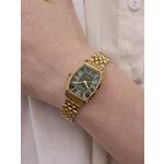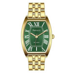 Корпус часов выполнен из высококачественного сплава с золотистым цветом, создавая эффект роскоши и стиля. Бочкообразная форма добавляет оригинальности дизайну, а зеленый циферблат с римскими цифрами придает часам особую изысканность. Удобный ремешок из нержавеющей стали также в золотистом цвете завершает общий гармоничный вид, а длина 175 мм и ширина 14 мм обеспечивают комфортную посадку на запястье.