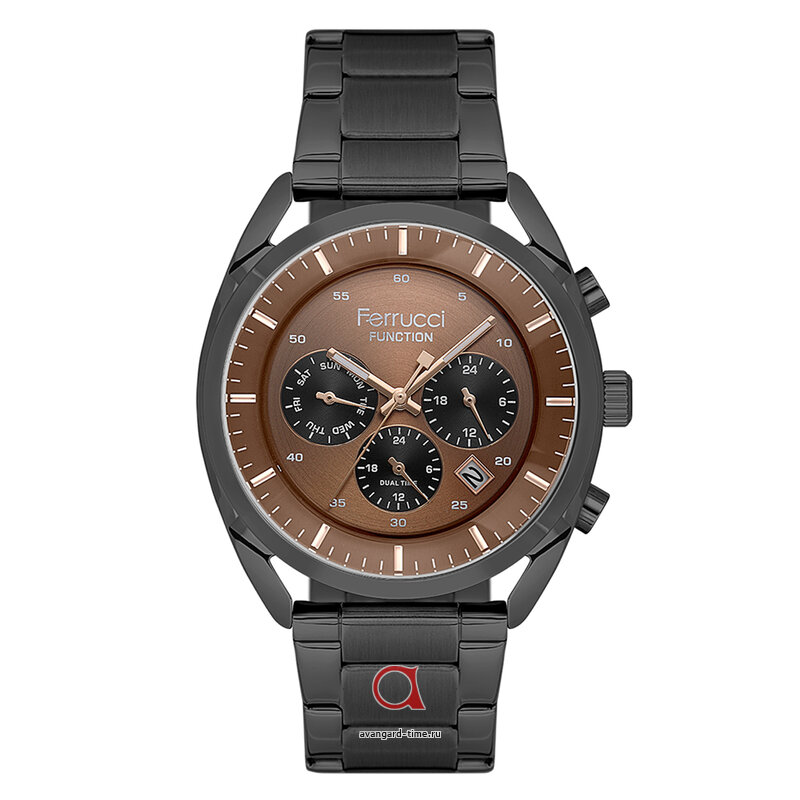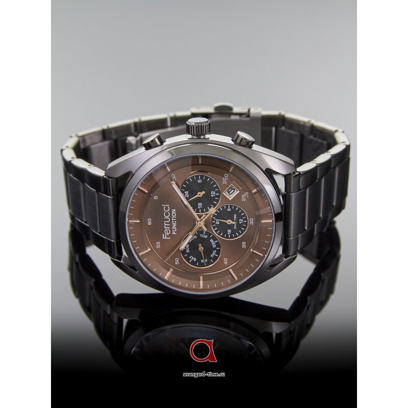 Шикарные часы FERRUCCI 03500-05 сочетают в себе классический стиль и современные технологии. Аналоговый способ отображения времени с подсветкой позволит легко узнать время даже в темное время суток. Черный корпус и нержавеющая стальной браслет создают элегантный образ. Коричневый циферблат и комбинированная индикация делают их стильным аксессуаром. Часы имеют календарь, второй часовой пояс и дополнительные циферблаты. Работают от батарейки, что обеспечит долгую и надежную работу. Гарантия 1 год. Водонепроницаемость 3 Bar позволит не беспокоиться за часы во время мытья рук. Эти часы подойдут взрослой аудитории и станут отличным подарком. Бренд FERRUCCI гарантирует качество и надежность. Эти кварцевые часы с минеральным стеклом идеально дополнят образ и будут служить долго. Made in China.