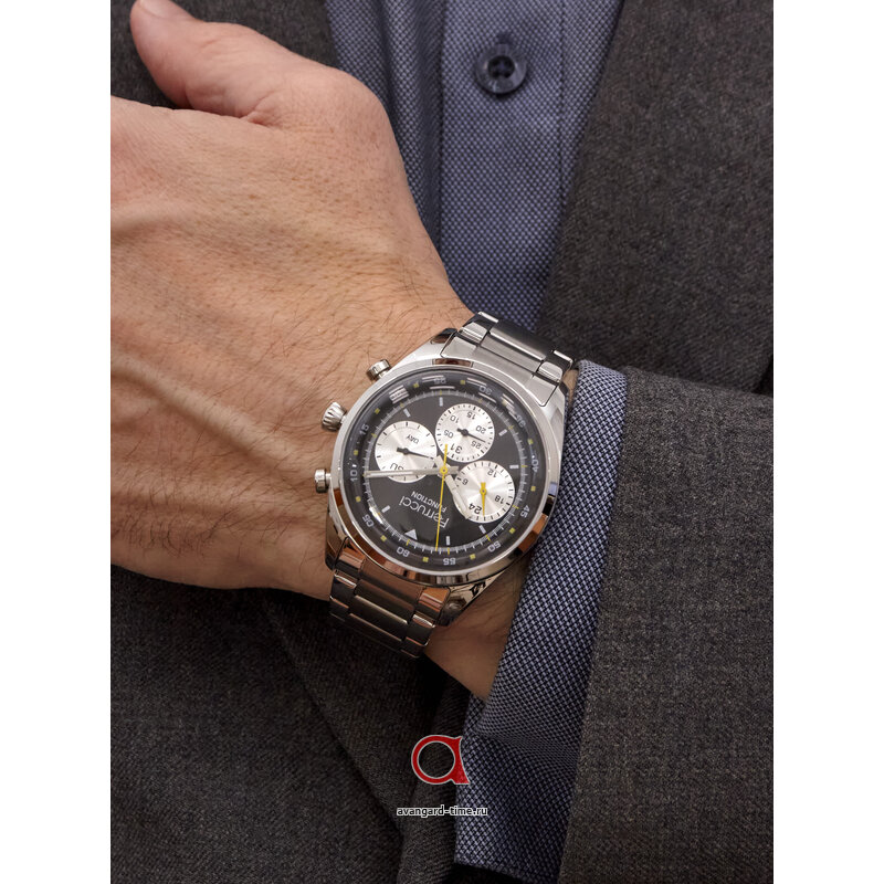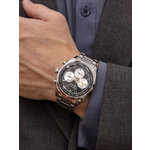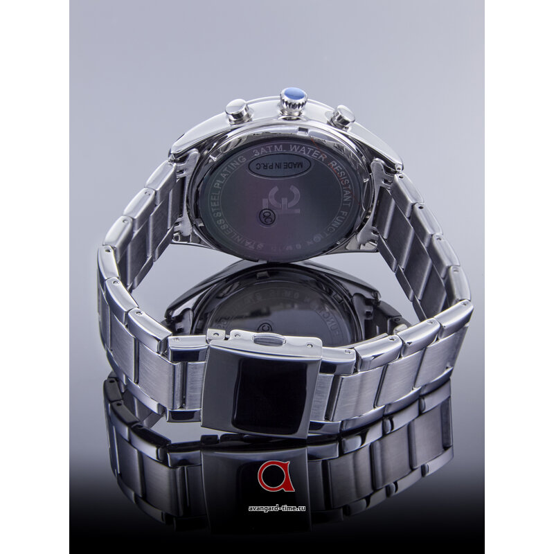 Корпус часов выполнен из хромированного алюминия, который не только придает изделию современный вид, но и обеспечивает долговечность. Черный циферблат контрастирует с серебристым браслетом из нержавеющей стали, создавая элегантный и солидный облик. Круглая форма корпуса и комбинированная индикация добавляют часам уникальности, а действующие дополнительные циферблаты делают их еще более функциональными.