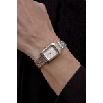 Корпус часов выполнен из высококачественного легированного металла с хромированным покрытием, придающего им современный и запоминающийся вид. Серебристый циферблат, украшенный стразами, успешно сочетает в себе утонченность и яркость, что делает эти часы настоящим украшением вашего запястья.