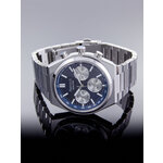 Корпус часов выполнен из прочного хромированного сплава, а браслет из нержавеющей стали добавляет вместительности и долговечности. Серебристый цвет браслета гармонично сочетается с глубоким синим циферблатом, создавая эффектный контраст, который точно привлечет внимание. Часы оснащены дополнительными циферблатами, которые добавляют функциональности, а удобные отметки делают считывание времени легким и быстрым.