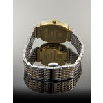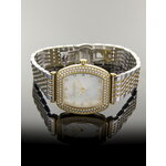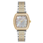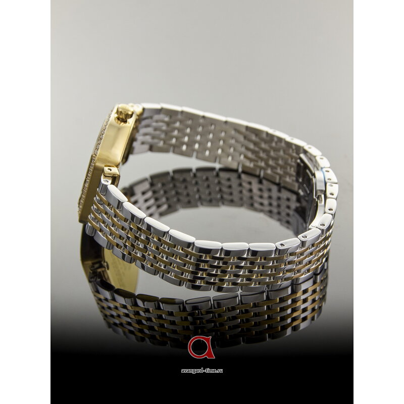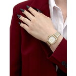 Часы имеют бочкообразную форму и изящный золотистый корпус, выполненный из высококачественной нержавеющей стали. Хромированный ремешок придаёт дополнительный блеск, а перламутровый циферблат с индикацией в виде меток и эффектными стразами создаёт восхитительный визуальный акцент.