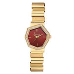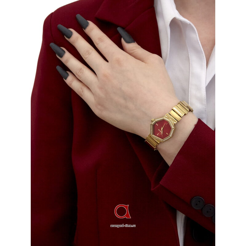 Циферблат бордового цвета с индикацией в виде отметок и эффектными стразами превращает каждую секунду в настоящее произведение искусства. Кварцевый механизм MIYOTA обеспечивает точность и надежность, а срок службы батареи позволяет наслаждаться любимыми часами долгое время.