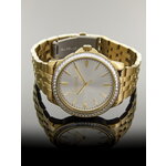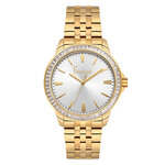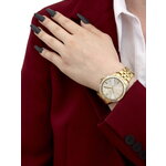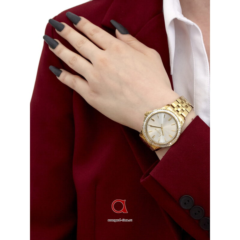 Часы имеют классическую круглую форму и выполнены из нержавеющей стали, что гарантирует не только долговечность, но и привлекательный внешний вид. Золотистый корпус и браслет идеально дополняют серебристый циферблат, придавая изделию особую изысканность, а изящные стразы добавляют блеска и шика. Они станут отличным акцентом вашего образа, привнося нотку роскоши в повседневный стиль.