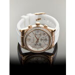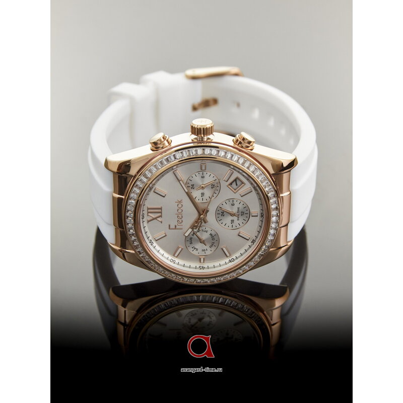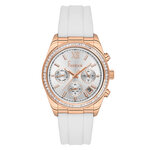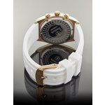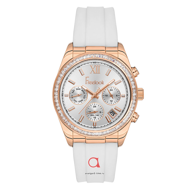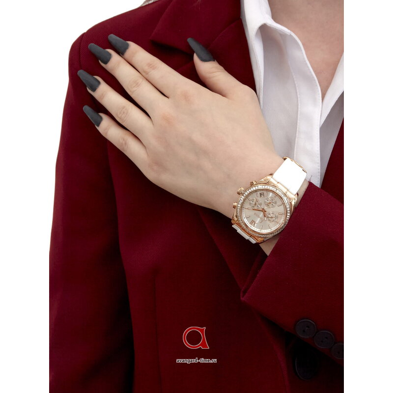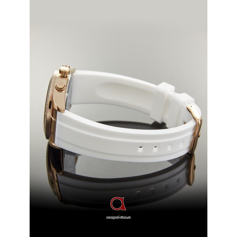 Корпус из нержавеющей стали с роскошным покрытием в цвете розового золота гармонично сочетается с белым силиконовым ремешком, создавая уникальный контраст. Серебристый циферблат, декорированный эффектными стразами, будет не только точным индикатором времени благодаря комбинированной индикации, но и настоящим украшением вашего запястья. Два дополнительных циферблата позволят легко отслеживать вторичный часовой пояс — идеальное решение для частых поездок.