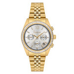Часы имеют круглообразную форму и классическую аналоговую индикацию времени, что делает их не только стильными, но и легкими в использовании. Серебристый циферблат с комбинированной индикацией времени и стразами придает часам роскошный вид, а дополнительный календарь и возможность отображения второго часового пояса подчеркнут вашу практичность и удобство.
